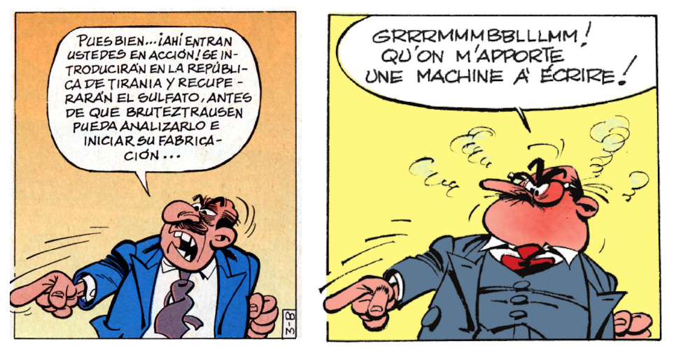 Existen más semejanzas que no hemos mostrado pero que pueden contrastarse: el Súper se asemeja en sus gestos al alcalde de Champignac. Uno de los generales de Bruteztrausen se basa claramente en un personaje aparecido en la aventura de Spirou "El viajero del mesozoico" (1957). Incluso las viñetas de la página 37 (con prismáticos, tanques y explosiones) guardan un gran parecido con los de la página 23 de la historieta "L'oeuf de Karamazout" (1964) de la serie Sophie, de Jidéhem y Vicq, como indicaba Hediondo en el foro de la T.I.A.
