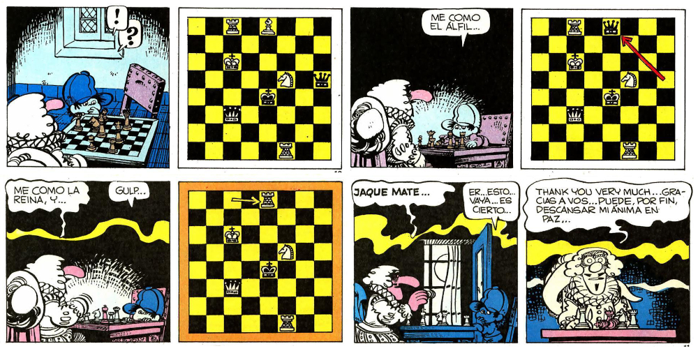 Jan se permite el lujo de darnos una pequeña clase de ajedrez en un toma y daca entre Pulgarcito y el fantasma de Sir Henry Strawberry, antepasado de Sir Strawberry, amigo británico del profesor Ogro. En la historieta, Pulgarcito ayuda a liberar el alma del fantasma, que parecía haber quedado prisionera al haber fallecido en extrañas circunstancias, dejando inconclusa esa partida de ajedrez que termina ganando ante Pulgarcito.