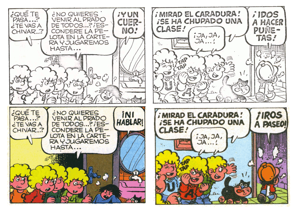 Viñetas originales y finales extraídas de la historieta "La clase chupada" (Pulgarcito nº 2, III/1981)