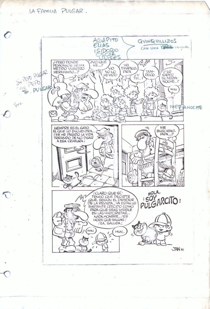 Durante todo ese tiempo, Jan fue capaz de crear muchísimas aventuras, a modo de fábulas, con Pulgarcito y Medianoche como protagonistas. A lo largo de esos casi dos años, Jan logró dibujar alrededor de novecientas páginas de la serie, que tuvo que compaginar precisamente con las de la supermedianía de acero, otra serie que llevaba poco tiempo en el mercado, pero que gozaba de un tremendo éxito, como vimos. Pulgarcito se publicó en más de setenta números, además de sus apariciones posteriores, como los cuatro cuentos troquelados de la colección Supertroquelados Pulgarcito (1983), los cinco álbumes de la colección Olé!entre octubre de 1981 y febrero de 1982 (y su posterior recopilación en un tomo de Super Humor, en marzo de 1982), los Cuadernos para pintar, en castellano y en catalán (1985), el volumen de Clásicos del Humor (RBA, 2009), las revistas Pulgarcito publicadas por Ediciones B (1987) o las historietas de la revista Super Guai! (1990).