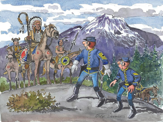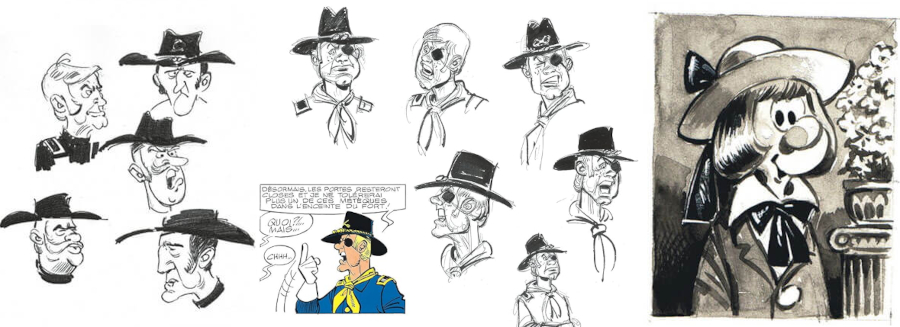 Bocetos de Willy Lambil que incluyen al capitán Nepel, férreo enemigo de los pieles rojas