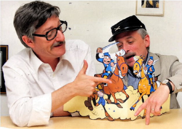 Raoul Cauvin (izquierda) y Willy Lambil (derecha), junto a sus personajes