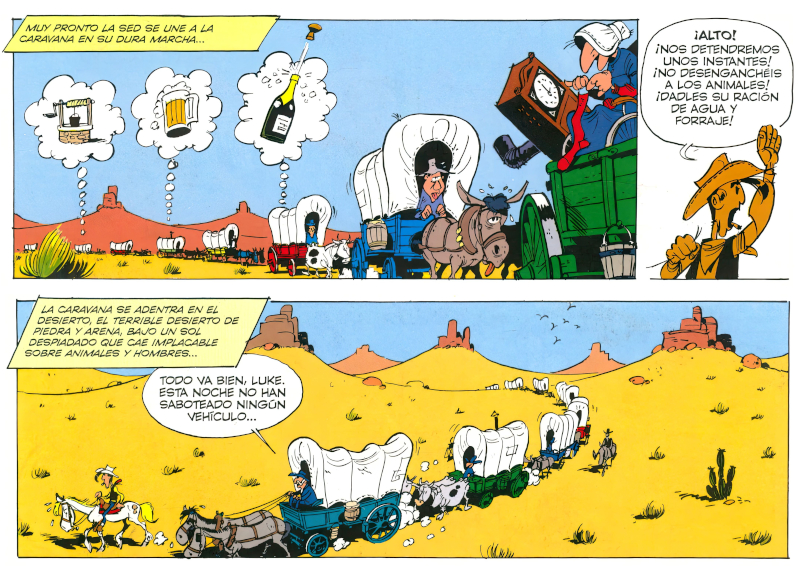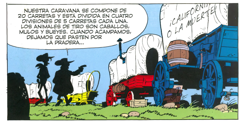 En mayo de 1962, Morris escribió una misiva a Goscinny para hacerle saber que había disfrutado de lo lindo con la sinopsis de la nueva aventura de Lucky Luke. René había imaginado una historieta en la que el cowboy capitanea una caravana de sesenta carros de pioneros que viajan al Oeste en busca de un futuro mejor. Es el argumento de La caravana, que apareció por primera vez en las páginas de la revista Spirou, entre los números 1281 (1/XI/1962) y 1302 (28/III/1963), y al año siguiente en álbum (el vigesimotercero de la colección de Dupuis). Morris le comentó a Goscinny que sesenta carros eran una barbaridad y este redujo la cifra a apenas una veintena. En aquel momento Lucky Luke estaba de moda, iba a más, y precisamente en 1964 fue la serie más votada en la encuesta entre los lectores, quedando por delante de otras series consagradas, como Spirou, Gastón el Gafe, Bill y Bolita o Los Pitufos. El esquema era muy similar al de otras aventuras pretéritas, como Las colinas negras o El ferrocarril de la pradera, con Lucky Luke abanderando a un colectivo o un convoy de un punto a otro. También lo hizo, de alguna manera, en Remontando el Misisipi, protegiendo el Daisy Belle del capitán Barrows.