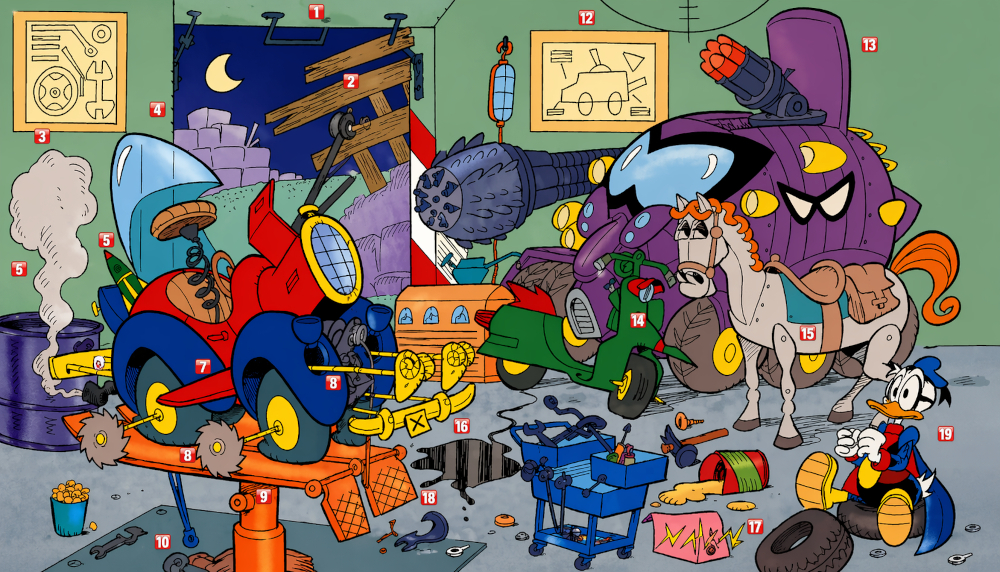 Precisamente, en uno de los clásicos de Disney, (Paperinik, un eroe e mille gadget), Marco Gervasio mostraba el refugio de emergencia de Fantomius transformado por Patomas en un garaje secreto, en el que guardaba otros vehículos y artefactos. Puede verse, por ejemplo, el prototipo del carro-móvil de Fantimius que aparecía en su diario, tomado de la primera historieta de Patomas (página 22).