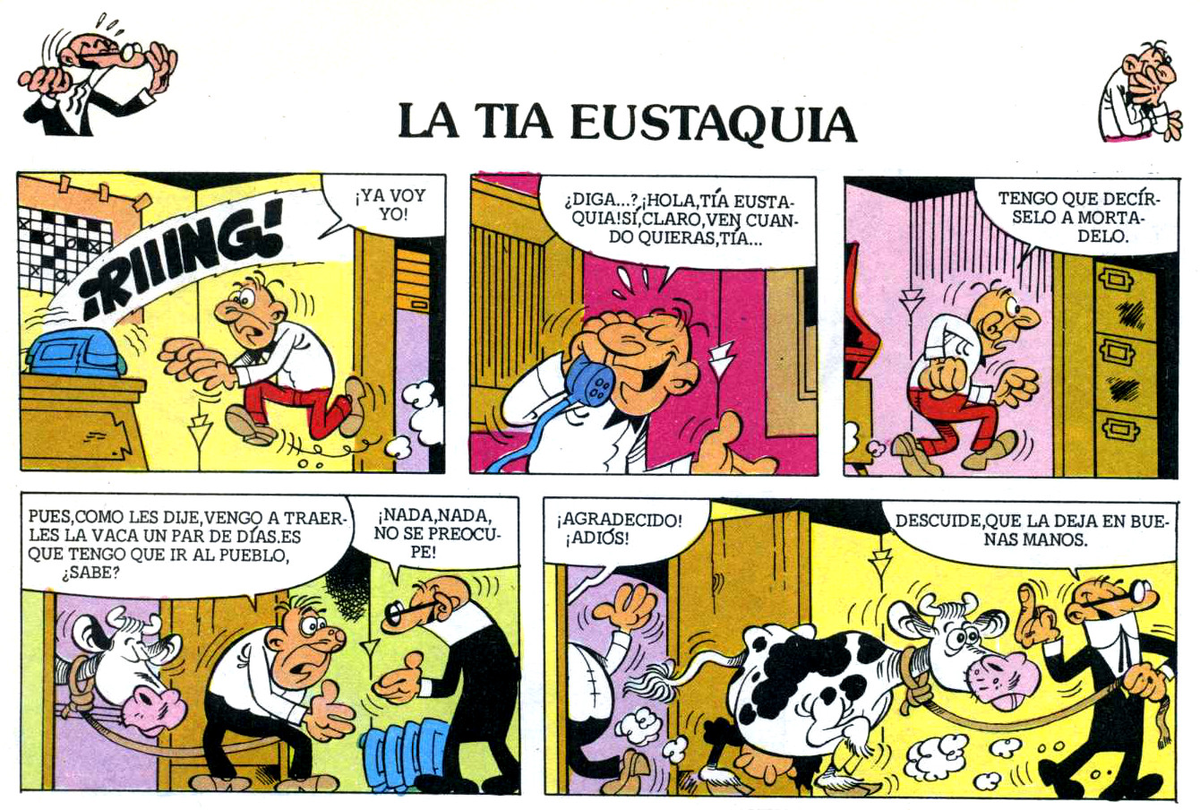 La tía de Filemón, Eustaquia, avisa a éste de que les hará una visita. Coincidirá con la visita de otra Eustaquia, una vaca, que le dejan al cuidado a Mortadelo...