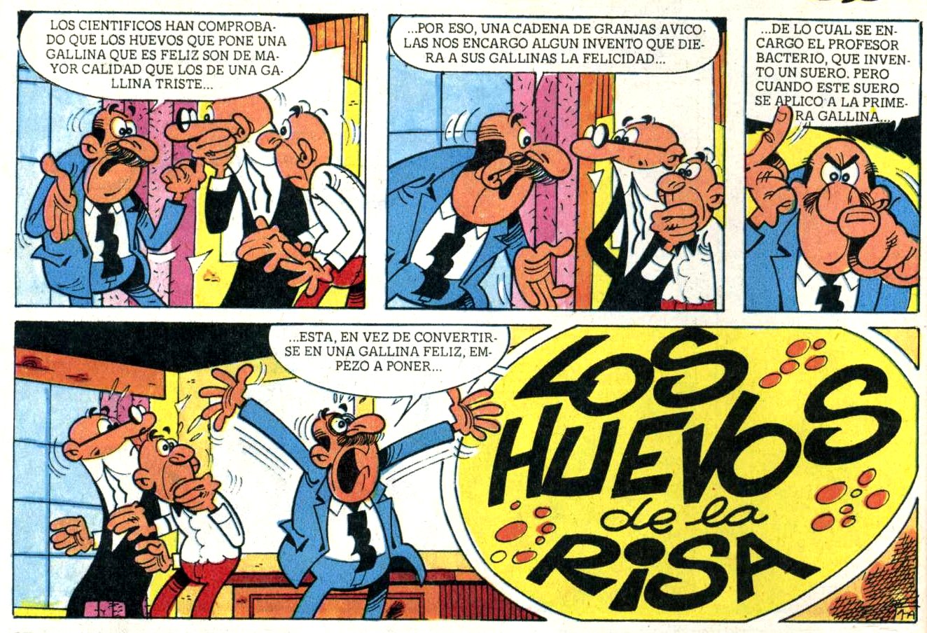 Los científicos han comprobado que los huevos que pone una gallina feliz son mejores que los que pone una gallina triste y por dicha razón una cadena de granjas avícolas encargó a la T.I.A. que elaborase un invento capaz de hacer felices a sus gallinas, tarea que asumió el profesor Bacterio. Pero cuando el suero se aplicó a la primera gallina, en lugar de convertirse en una gallina feliz, comenzó a poner los huevos de la risa, que provocan la risa en el individuo sobre cuya cabeza ha puesto el huevo la gallina en cuestión, que además ha escapado de la organización. Mortadelo y Filemón deberán atrapar a la gallina cuanto antes para evitar que provoqué el caos en la ciudad.