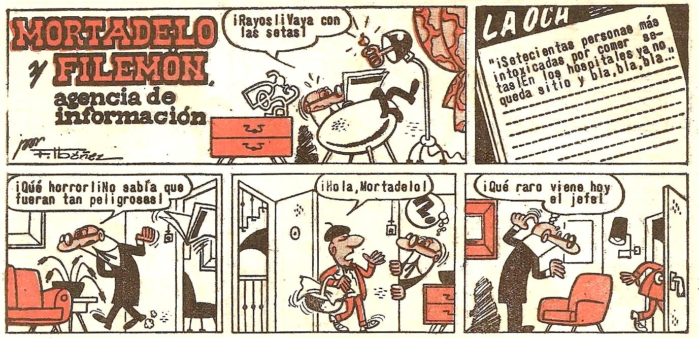 Como Mortadelo lee en el periódico que más de setecientas personas habían sido hospitalizadas por comer setas venenosas y al rato ve llegar a su jefe con una cesta llena de setas, sin dudarlo las echa a la basura antes de que aquel pueda comérselas, pero lo malo es que al rato Filemón le dirá que había traído unos microfilms de alto valor estratégico camuflados en el interior de unas setas para despistar a los espías y que había de llevarlas a la embajada de Turulandia.