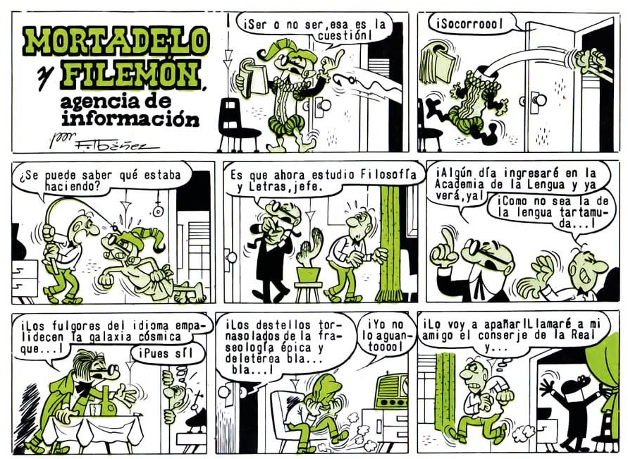 Mortadelo no hace más que estudiar filosofía y letras porque quiere ingresar en la academia de la lengua pero, como Filemón está harto de oirle recitar pesados discursos y poesías, decide llamar a su amigo de la Real de la Lengua, quien le ofrece un empleo allí para que dé brillo y esplendor. Pero cuando éste llega a la academia descubre que el empleo era para fregar el suelo de la misma.