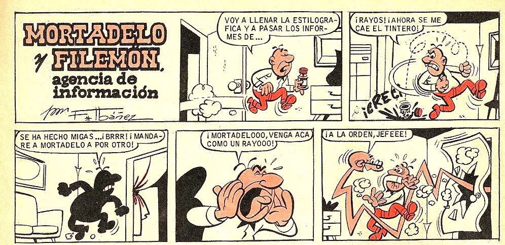 Al ir a llenar la estilográfica para pasar unos informes a Filemón se le cae el tintero y se le rompe, de modo que manda a Mortadelo traerle otro, pero éste lo entiende mal y le trae un tintorero.