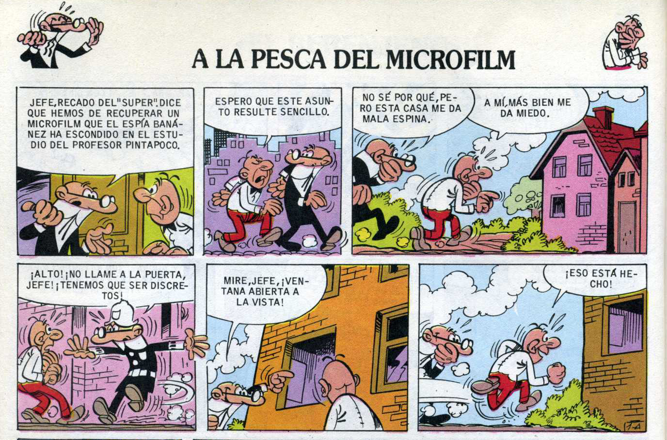 El Súper pide a Mortadelo y Filemón que recuperen un microfilm que el espía banánez ha escondido en el estudio del profesor Pintapoco.