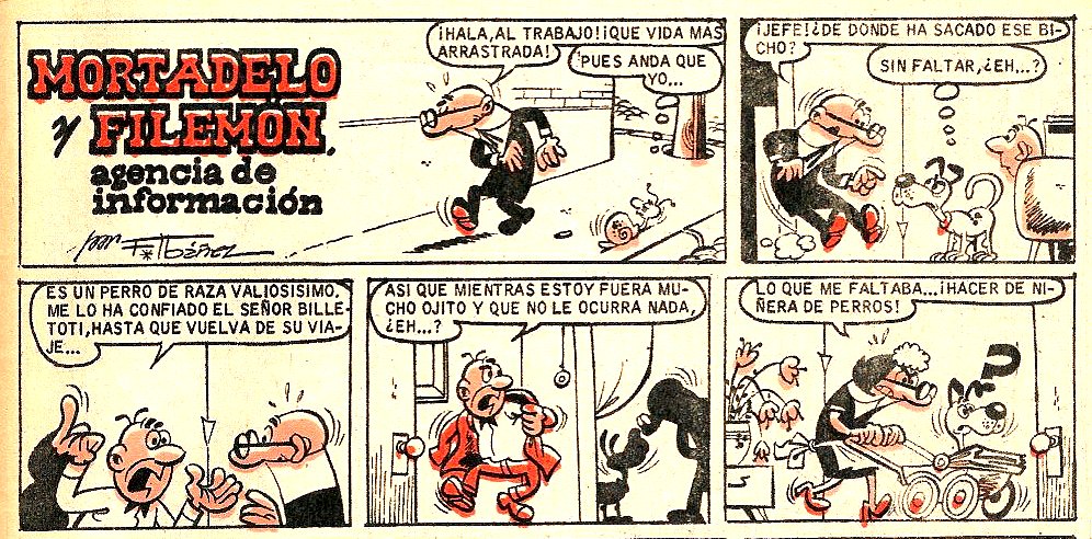 Filemón manda a Mortadelo custodiar un valiosísimo perro de raza que el señor Billetoti le ha confiado pero, al rato, aquel se entera de que se ha producido un incendio en el edificio. Al llegar, Mortadelo le cuenta que con su disfraz de bombero ha logrado apagar el fuego y que el perro no se ha chamuscado nada pero que ha tenido que echar tantos litros de agua que al final el animal ha muerto ahogado.