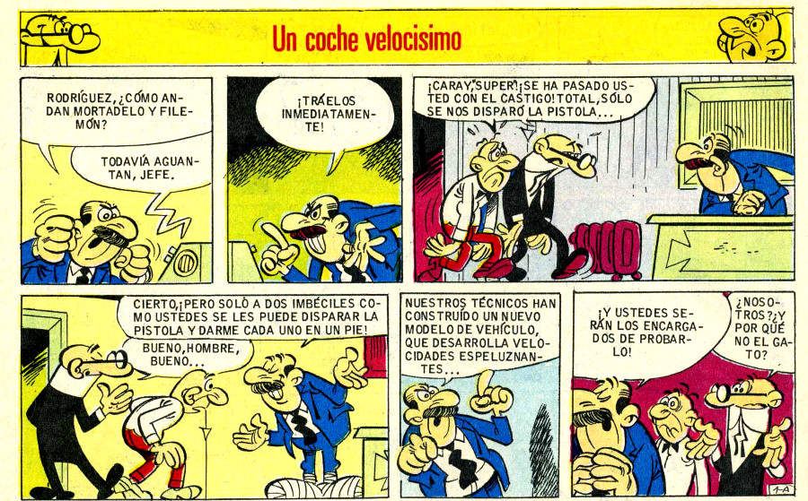 Los técnicos de la TIA han desarrollado un nuevo modelo de vehículo que puede alcanzar velocidades espeluznantes. El Súper mostrará a Mortadelo y Filemón las capacidades del vehículo.