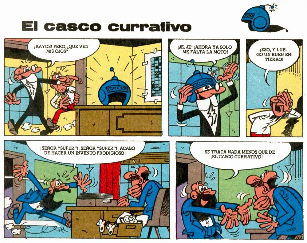 El profesor Bacterio ha inventado un casco "currativo": quien se lo pone empieza a currar como un loco y no para hasta que le quitan el casco. Mortadelo se lo pone por accidente y empieza a trabajar como un loco, provocando cierto caos en la organización, coincidiendo con la visita del propio Director General de la T.I.A. acompañado de una de sus mejores amigas.