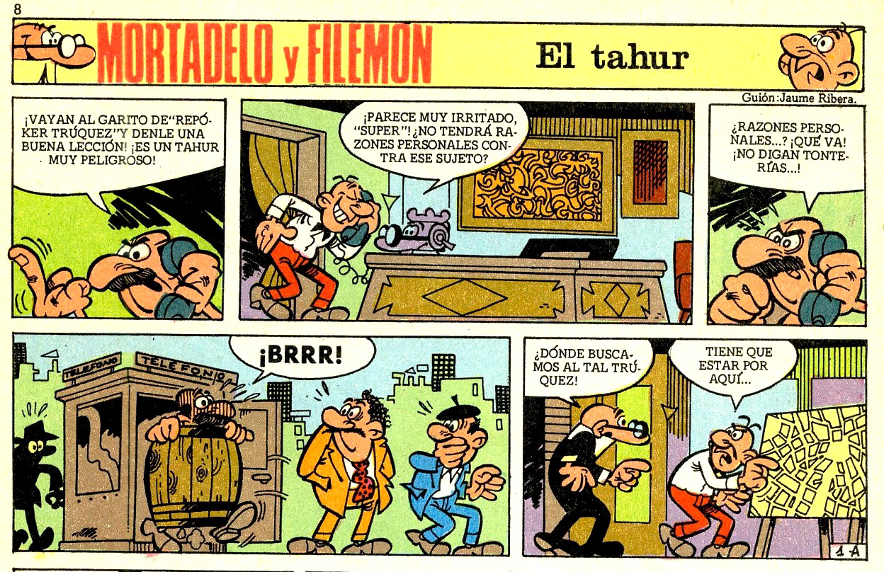 El Súper ha pedido a Mortadelo y Filemón que acudan al garito de Repóker Trúquez para darle una buena lección porque es un peligroso tahur.