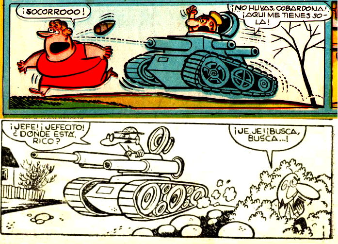 Ibáñez también se dejó seducir por el estilo del gran Manuel Vázquez (tal como explicaba mortadelon en su blog) con quien mantuvo una relación muy estrecha. En los primeros compases de Mortadelo y Filemón, utilizaba el recurso de las metáforas visuales, que Vázquez ya había utilizado en sus series. En la época en la que ambos trabajaban muy de cerca, Ibáñez cogía ideas de Vázquez que encontraba divertidas, como el tanque que aparece bajo estas líneas como final de historieta:![]() Mortadelo y Filemón (Ibáñez, Pulgarcito nº 1402, III/1958) Las Hermanas Gilda (Vázquez, Pulgarcito nº 1339, I/1957) ![]() Las Hermanas Gilda (Vázquez, Pulgarcito nº 1433, 20/X/1958) Mortadelo y Filemón (Ibáñez, Pulgarcito nº 1435, 3/XI/1958) |