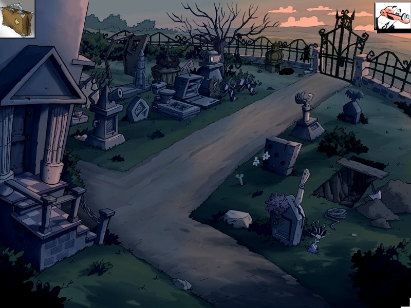 Abandonamos el parque para dirigirnos al cementerio. Allí utilizaremos el paraguas en el canelón y con Filemón al mando iremos a la Oficina de Información para hablar con la azafata y que nos dé un mapa. Con el mapa en mano iremos al cementerio junto a Mortadelo y con éste de nuevo utilizamos el vodka en el canelón con ayuda de Filemón. Para entrar deberemos usar la percha en la cerradura de la puerta. Finalmente cogemos el collar del perro. Tendremos la opción de ir por el camino y examinar la tumba de Rasputín para obtener una pista posterior. Regresamos en todo caso al Museo con ambos agentes y hablamos con la azafata de la entrada y con el guardia del fondo.