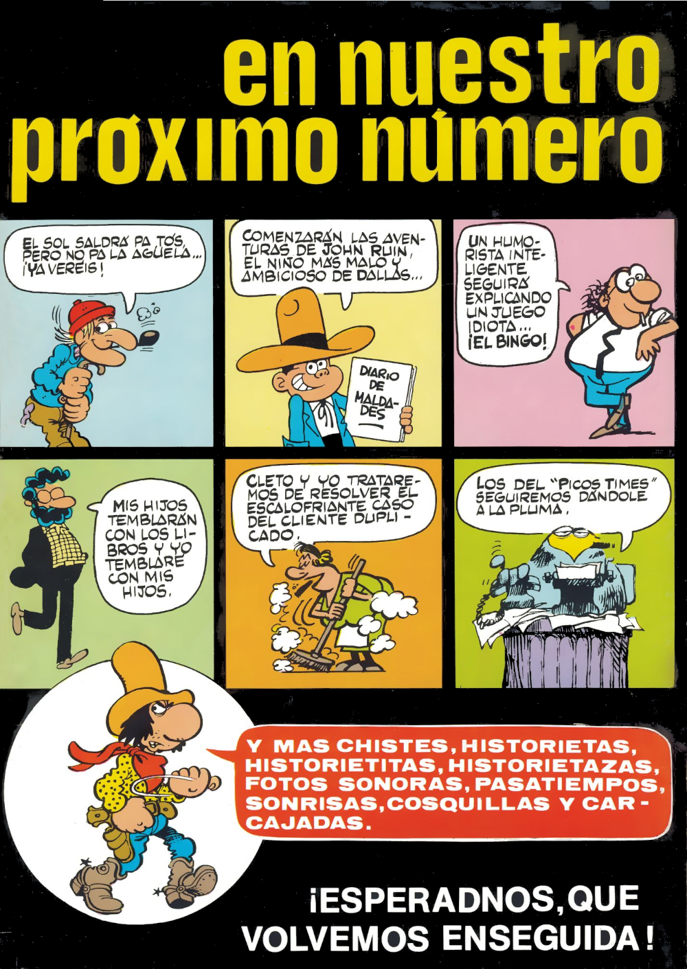 El primer número de la revista abría con un fotomontaje de chistes en la sección "Fotos sonoras" y con la presentación de la revista, que recuperaba también series publicadas en la prensa estadounidense, como Picos (Shoe), creada por el dibujante Jeff MacNelly, ganador de tres premios Pulitzer. Se trataba de una serie de pájaros de aspecto antropomorfo que trabajan en el periódico The Picos Times (The Treetop Tattler). También El mundo loco de Jorge, de (Virgil Partch). Los últimos de Villapiñas estaba entre las primeras historietas de la revista, que también incluía otra conocida serie de Jan: Cab Halloloco, un divertido western en clave de humor. Vázquez también tuvo cierto peso en JAuJA, con sus series Vámonos al bingo o Los casos de Ana y Cleto. Complementaban la revista otras series: Quico (Jose Luis Martín), Iñigote, un tipo con bigote (Bernet Toledano & José García), El buscador de oro, J.R., nadie te quiere (Cubero), Gómez and Gómez (Koski), entre otras, además de secciones adicionales con pasatiempos y chistes (¿De qué se ríen...?, Gimnasio mental, Lo dijo...).
