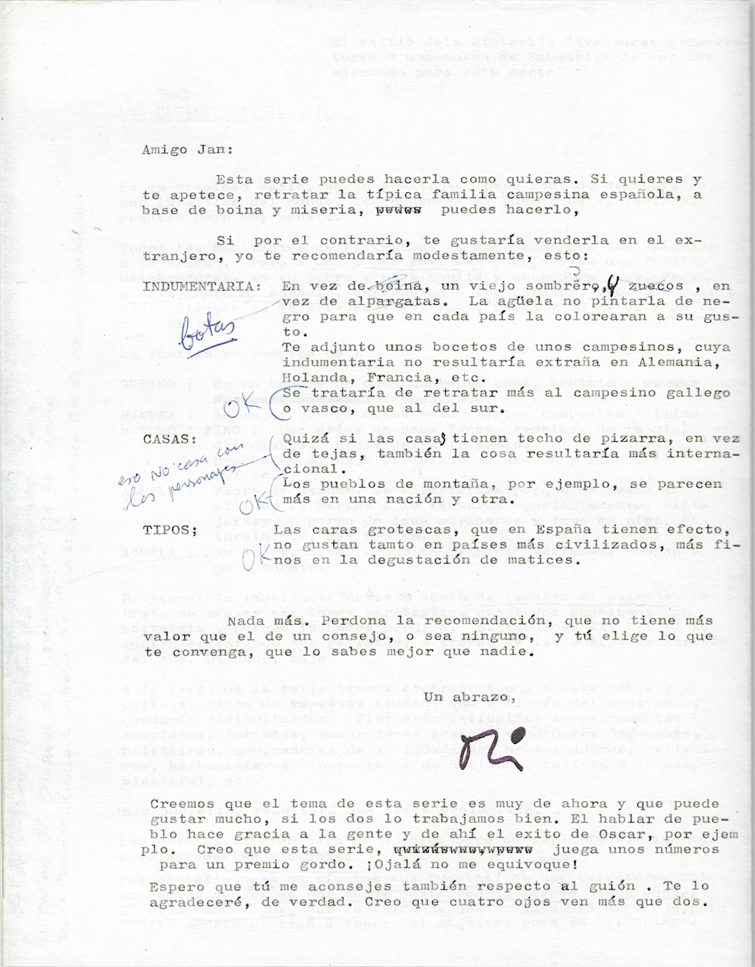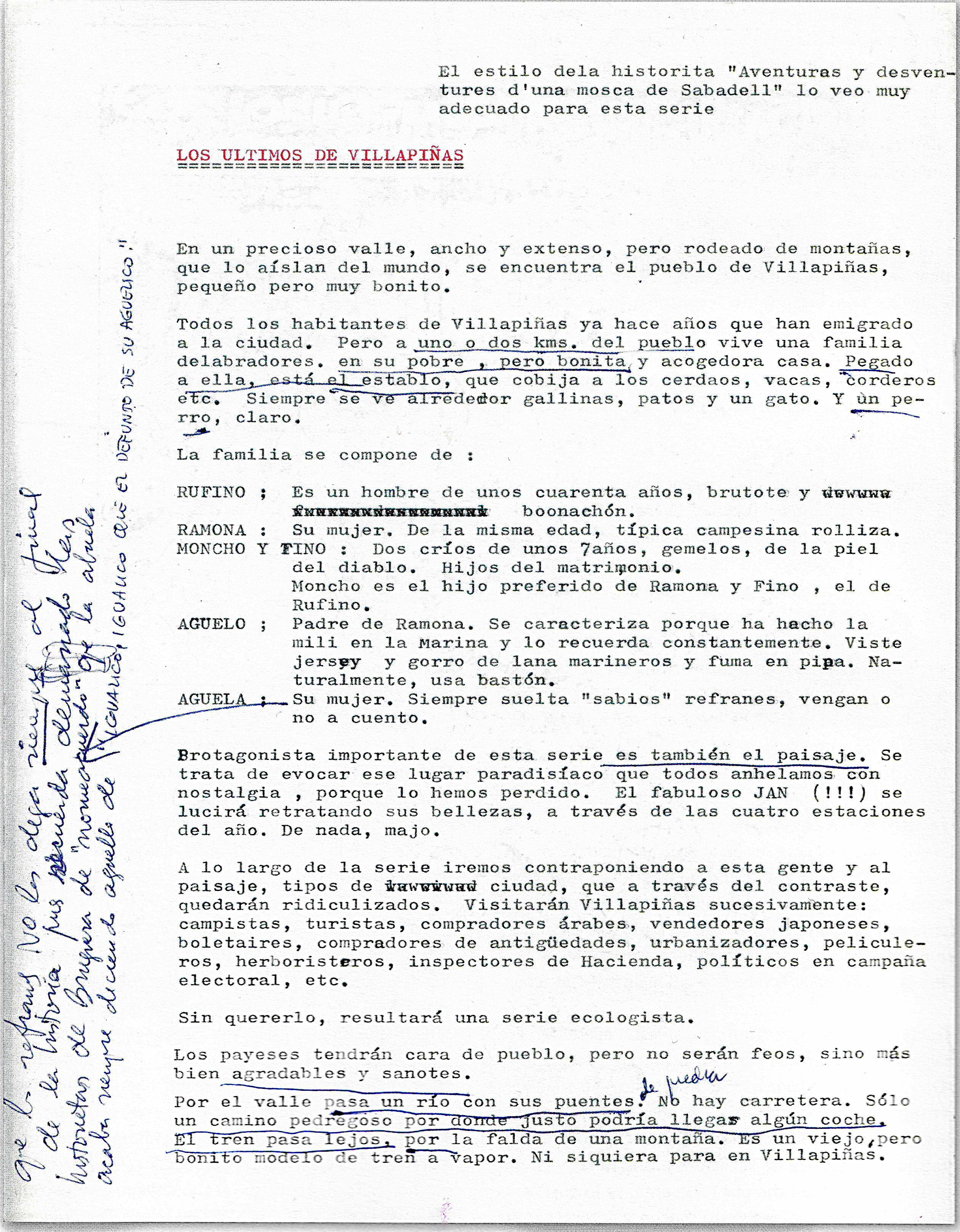 Oli también indicó a Jan notas e ideas de cara a los primeros compases de la serie: "Visitarán Villapiñas, sucesivamente, campistas, turistas, compradores árabes, vendedores japoneses, boletaires, compradores de antigüedades, urbanizadores, peliculeros, herboristeros, inspectores de hacienda, políticos en campaña electoral, etc. Sin quererlo, resultará una serie ecologista. Los payeses tendrán carea de pueblo, pero no serán feos, más bien agradables y feotes". Lo cierto es que, finalmente, varias de esas propuestas contaron con historieta propia, pues sí vemos a unos marchantes de antigüedades (Melquíades, negocio de antigüedades), el rodaje de una película de piratas (Superagüelo el aventurero), pero también buscadores de tesoros, de setas y otros mas surrealistas como un agente secreto en mitad del campo... ¡y hasta extraterrestres!