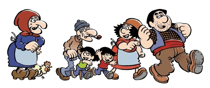 Dicho esto, hablemos ahora de los seis protagonistas: se trata de un matrimonio de unos cuarenta años, integrado por Rufino y Ramona, sus dos hijos (Fino y Moncho) y los padres de Ramona, dos "agüelos". Una curiosidad: como puede verse en el boceto que aparece bajo estas líneas, los autores de la serie (Jan y Oli) habían pensado en otros nombres para Rufino y Ramona: Faustino y Avelina. Quizá pensaron que tenía más sonoridad utilizar nombres que comenzasen por erre y que además los lectores asociaran al mundo rural, como sucede con Ramona y Rufino. O quizá los modificaron a posteriori, tras decidir los nombres sus hijos, los gemelos Moncho y Fino, que parecen apócopes de Ramón y Rufino. La apariencia de los protagonistas es el propio de los pueblos: Rufino es un hombre de aspecto embrutecido, y Ramona es una mujer oronda, rolliza. Sus hijos, los mencionados Moncho y Fino, tienen unos siete años de edad y son un tanto gamberros, siendo Moncho el ojito derecho de Ramona y Fino el favorito de Rufino. Ambos tendrán un rol destacado en varias de las historietas de la serie.