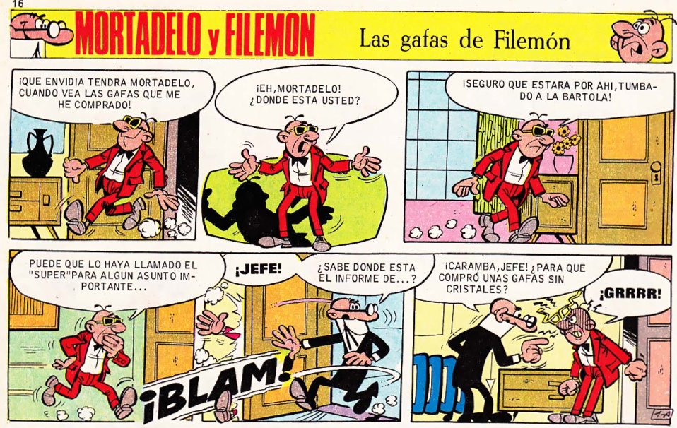 Filemón se presenta ante Mortadelo con unas gafas nuevas pero, de una u otra forma, Mortadelo siempre termina rompiéndoselas de manera fortuíta. Se trata de una versión de la historieta realizada por Ibáñez para el Pulgarcito 1832.