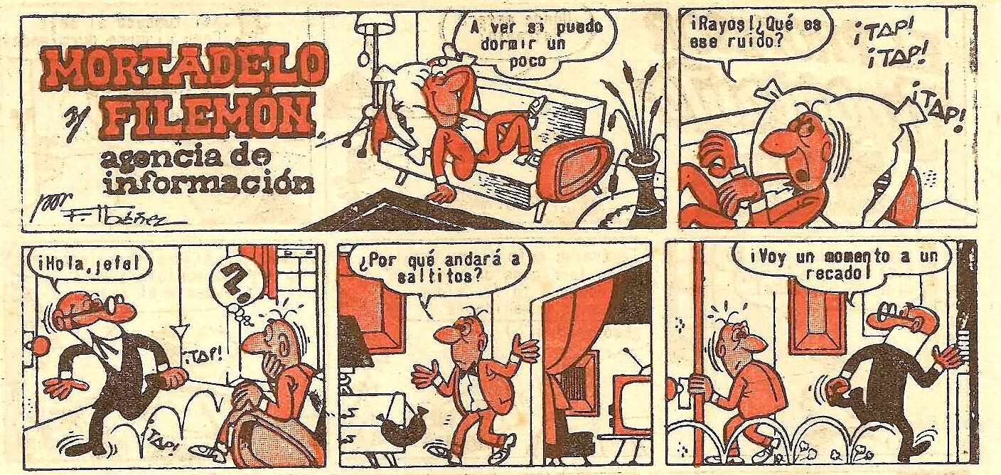 Mortadelo anda contínuamente dando saltos a la "pata coja" sobre su pierna izquierda, lo que despertará la curiosidad de Filemón por su rara forma de caminar.