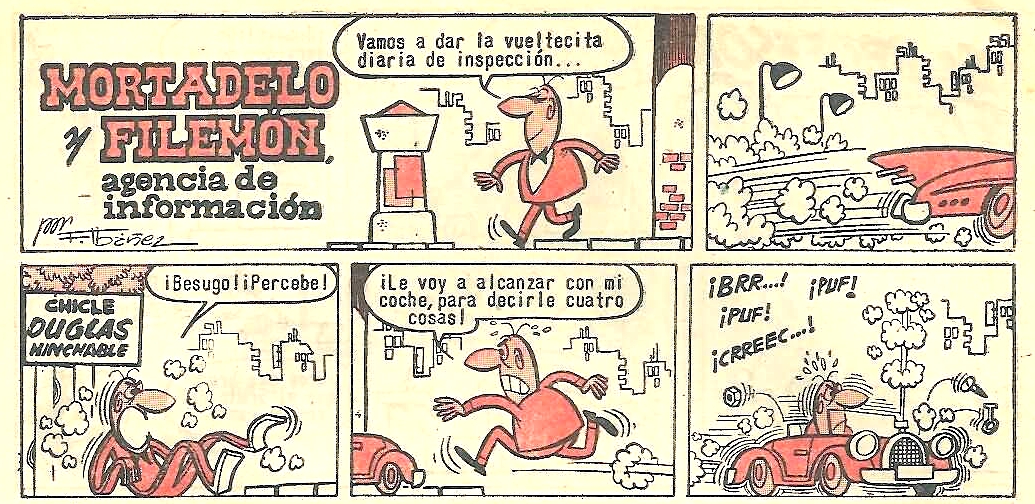 Filemón se queja de lo lento que va su coche y Mortadelo le habla de un amigo que vende uno que coge doscientos por hora. Doscientos metros por hora, claro...