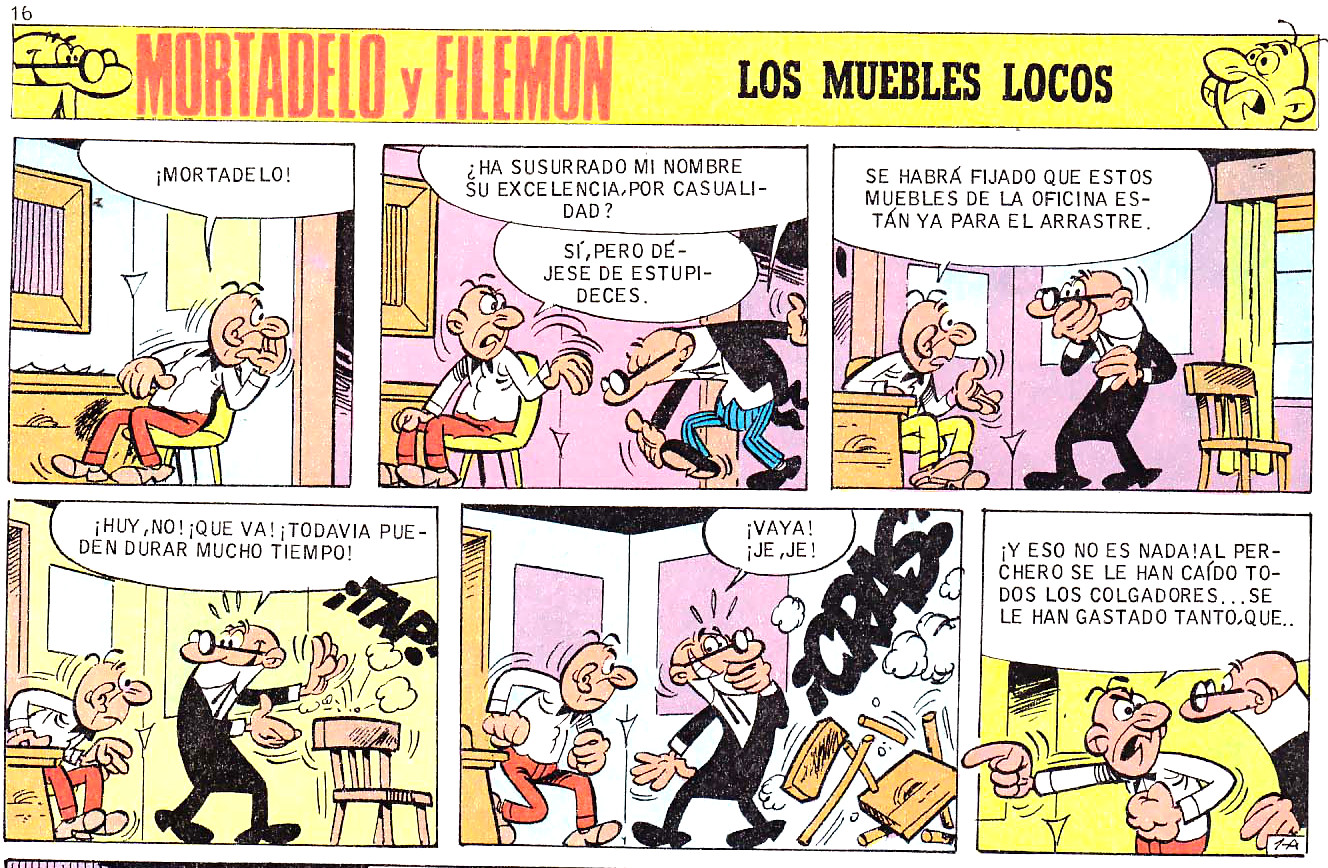 Los muebles de la oficina se caen a pedazos y Filemón pide a Mortadelo que vaya a renovar el mobiliario.