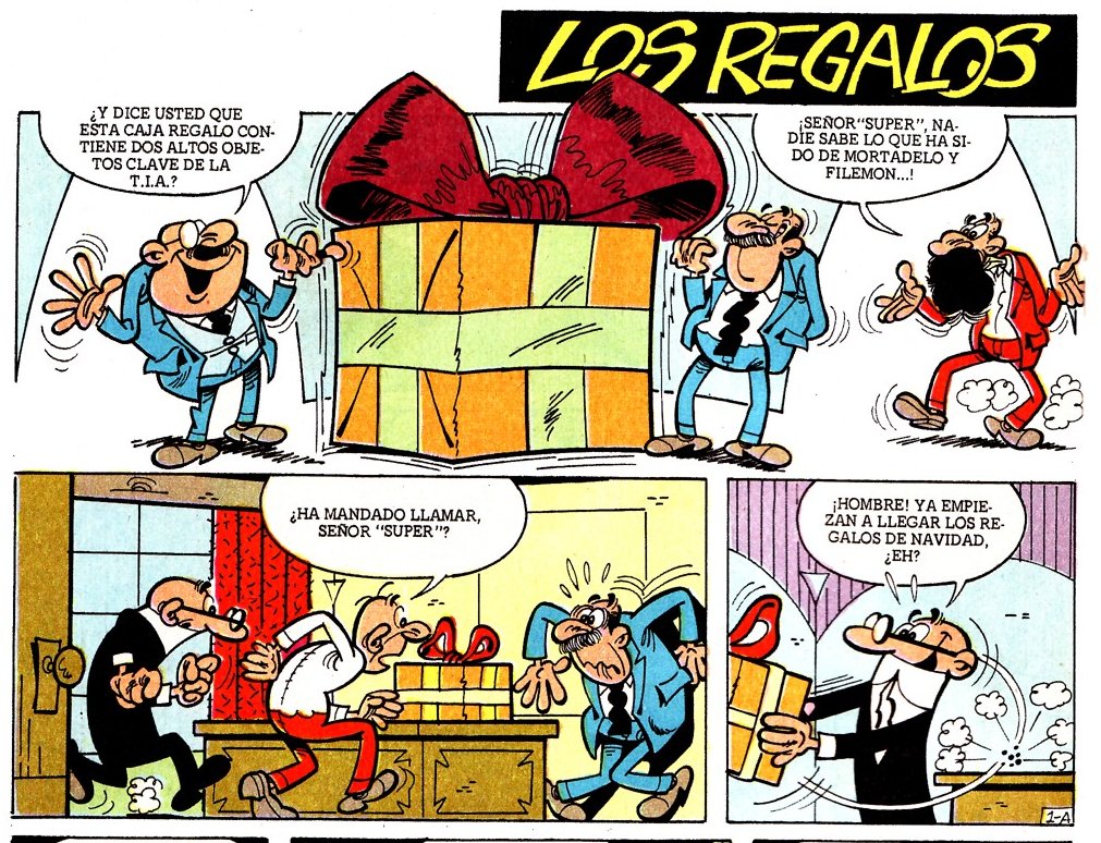 Todos los años las organizaciones como la T.I.A. (tanto amigas como enemigas) suelen felicitarse mutuamente cuando llegan las fiestas navideñas. La T.I.A. envió por error varios regalos con una bomba de relojería en su interior que fueron explotando al ser abiertos por sus receptores. El Súper teme una venganza y llama a Mortadelo y Filemón para que sean ellos quienes se encarguen de abrir todos los regalos que han recibido.