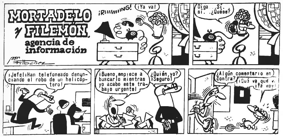 Han robado un helicóptero y Filemón pide a Mortadelo que se ponga tras la pista de los ladrones. Mortadelo consigue recuperar un helicóptero pero poco después el cliente les aclara que lo que él había perdido era un coleóptero.