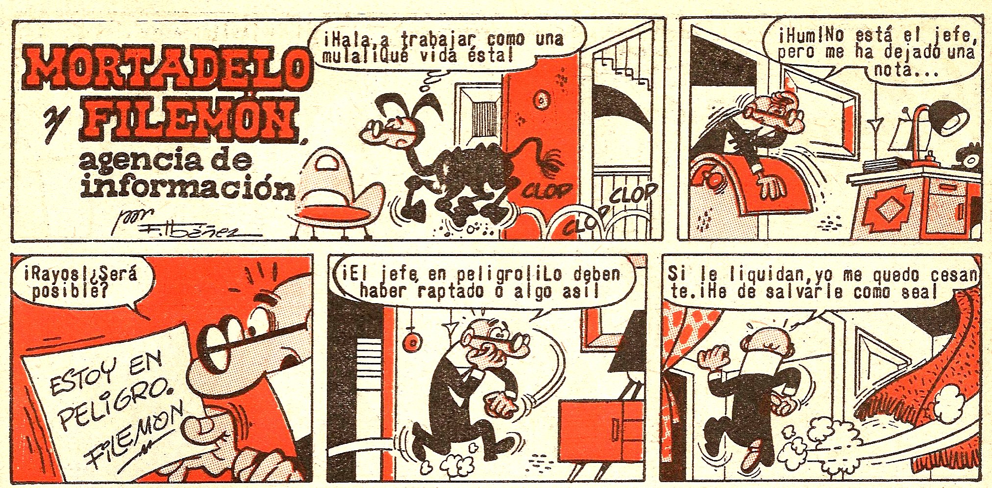 Mortadelo llega a la oficina y ve una nota en la que Filemón le dice que está en peligro. Alarmado, llama a toda prisa a la policía, al ejército, a los bomberos y sale a buscarle con toda su artillería, pero de repente ve a Filemón tan tranquilo por la calle, y este le dice que estaba en el bar "Peligro".