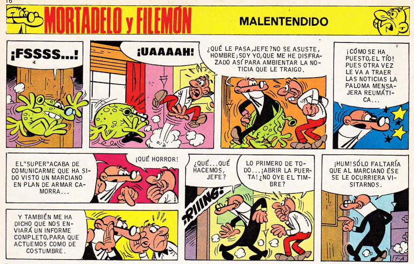 El Súper ha llamado a Mortadelo para decirle que ha visto a un marciano con ganas de armar camorra y que les enviará un informe completo para que actúen, como de costumbre