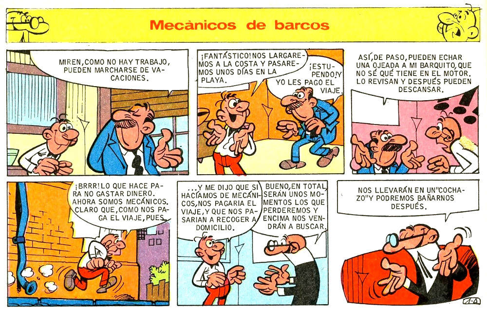 El Súper concede unos días de vacaciones a Mortadelo y Filemón dado el escaso trabajo que hay en la T.I.A. Sabedor de que los agentes acudirán a la playa, les pide que revisen su pequeño barco para solucionar un pequeño problema que hay en su motor...