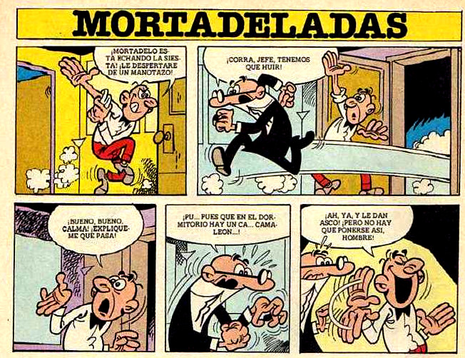 Mortadelo incita a su jefe a abandonar la vivienda inmediatamente porque hay un camaleón en su habitación. Filemón resta importancia al asunto; no sabe que lo que Mortadelo en realidad quería decir era que había un león en su cama...