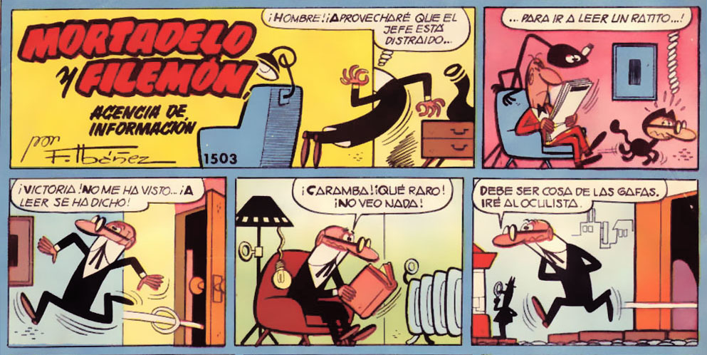 Mortadelo se pone a leer un libro de Filemón y cree necesitar unas gafas nuevas ya que no consigue leer nada. Filemón le comenta posteriormente que el libro está en blanco y en él tiene pensado escribir sus memorias.