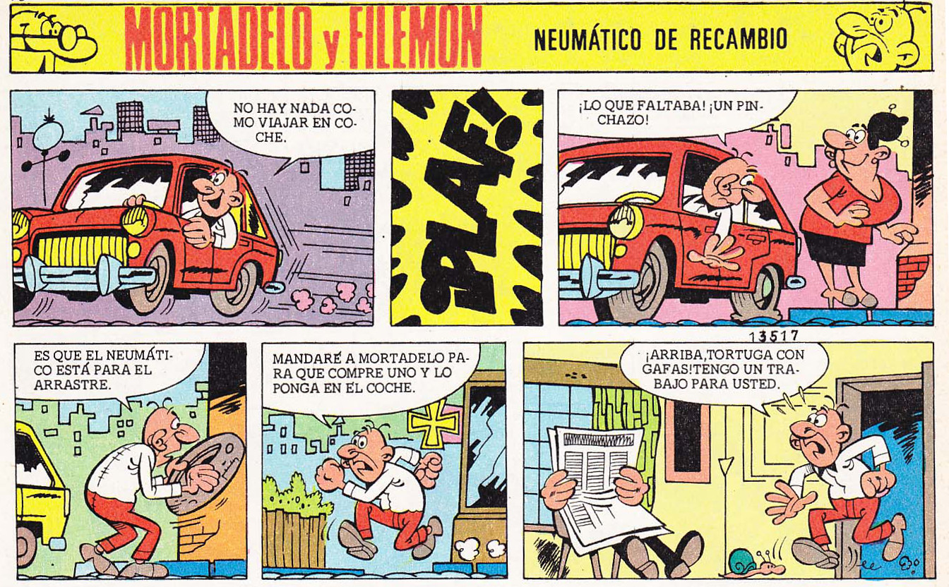 Mortadelo sufre un pinchazo en su coche y pide a Mortadelo que acuda a comprar un neumático nuevo y lo coloque en su coche ipso facto.