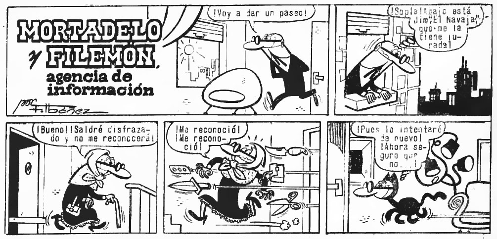 Jim el "Navaja", un delincuente que se la tiene jurada a Mortadelo, le espera en la puerta de la agencia de información. Mortadelo decide disfrazarse de abuela para pasar desapercibido sin demasiado éxito y termina regalando a Filemón un disfraz de Mortadelo para confundir al delincuente.