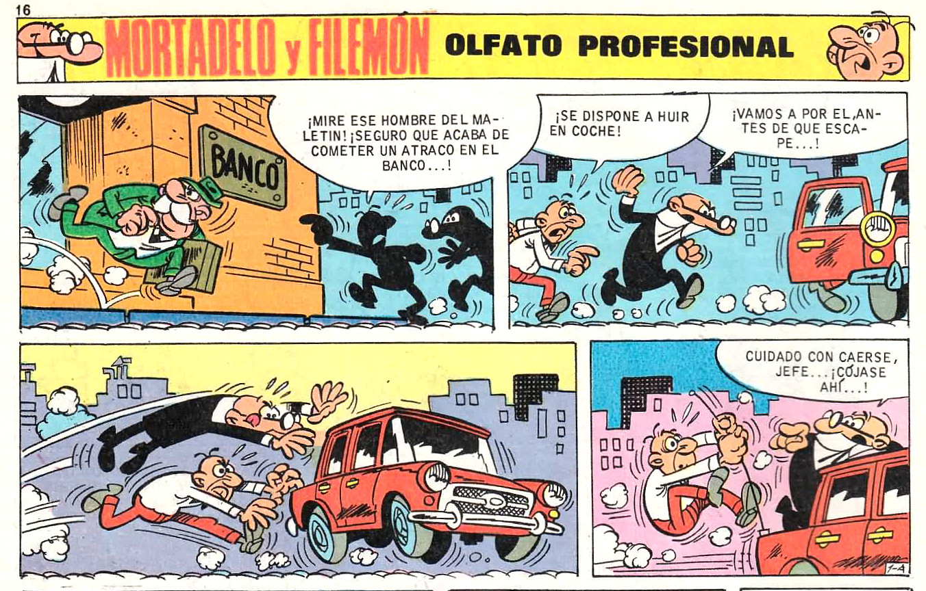 Mortadelo y Filemón se cruzan con un tipo que escapa de un banco con un maletín en los brazos y deciden perseguirle. Se inicia entonces una interesante persecución automovilística.