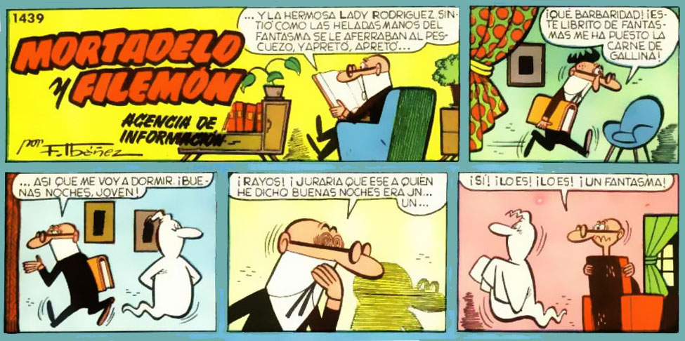 Filemón se sugestiona leyendo una novela de fantasmas y cree ver uno deambulando por la casa cuando en realidad Filemón envuelto en una sábana que padece de sonambulismo.