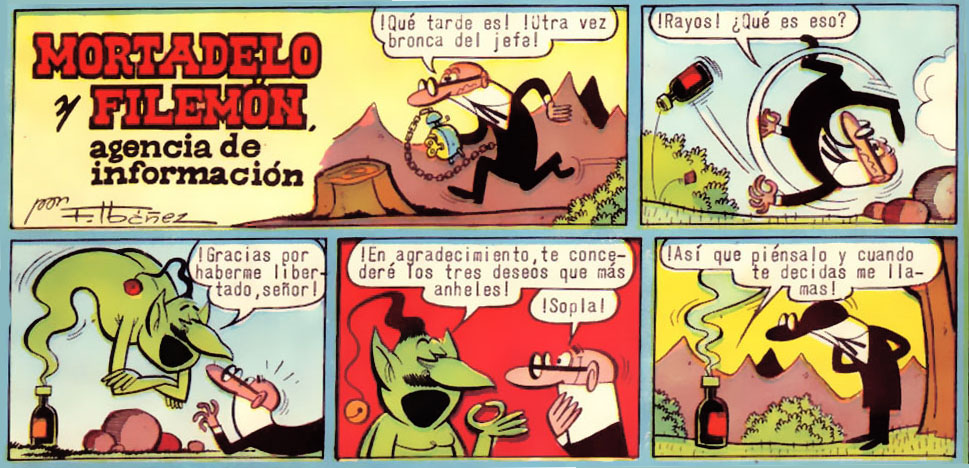 Mortadelo encuentra una botella con un genio en su interior y le concede tres deseos aunque le da tiempo para que se lo piense. Mortadelo se lleva la botella a casa pero Filemón, accidentalmente, se la entrega a un trapero que le dió dos pesetas por ella.