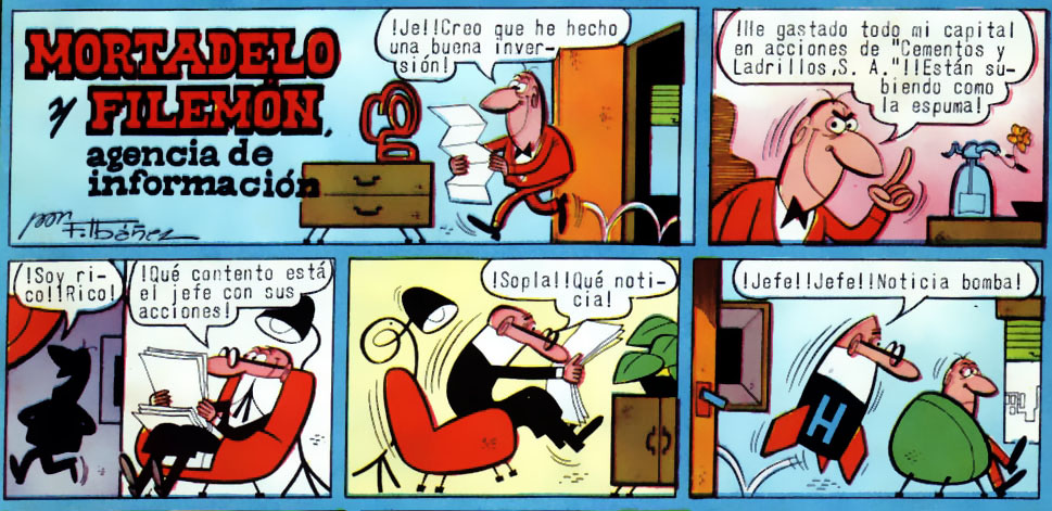 Mortadelo ha invertido todos sus ahorros en acciones de "Cementos y Ladrillos S.A." porque están subiendo como la espuma. Mortadelo termina convenciéndole para que venda las acciones cuanto antes...