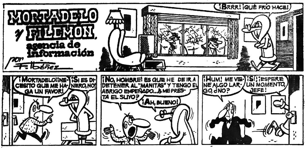 Filemón tiene que salir a detener al "Manitas" pero no tiene un abrigo a mano y le pide uno prestado a Mortadelo. La espera por un abrigo a medida se hace tan larga que cuando Mortadelo llega a casa el "Manitas" ha hecho puré al pobre Filemón.