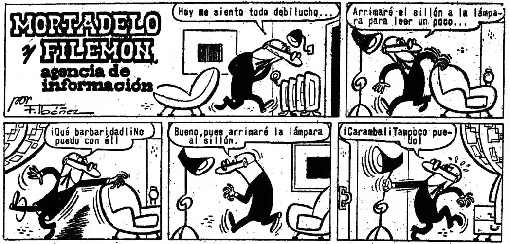 Mortadelo está debilucho y no es capaz de mover un triste taburete. Poco después Filemón le comenta que lo ha clavado al suelo porque vienen sus sobrinitos a casa y no quiere que lo arrastren por ahí.