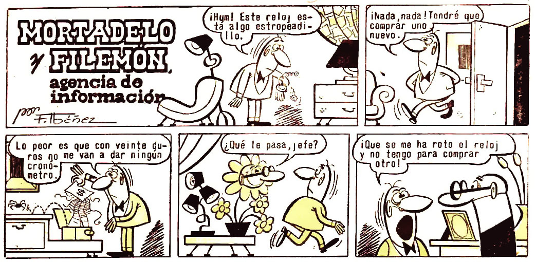 A Filemón se le ha estropeado el reloj y quiere comprar uno nuevo pero no tiene mucho presupuesto. Mortadelo le comenta que el suyo (un reloj de arena) no se ha averiado en veinte años.