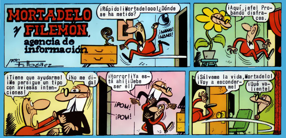 Filemón ruega a Mortadelo que le ayude a protegerse de un tipo que le persigue con aviesas intenciones pero Mortadelo se limita a dejarle entrar hasta la cocina.