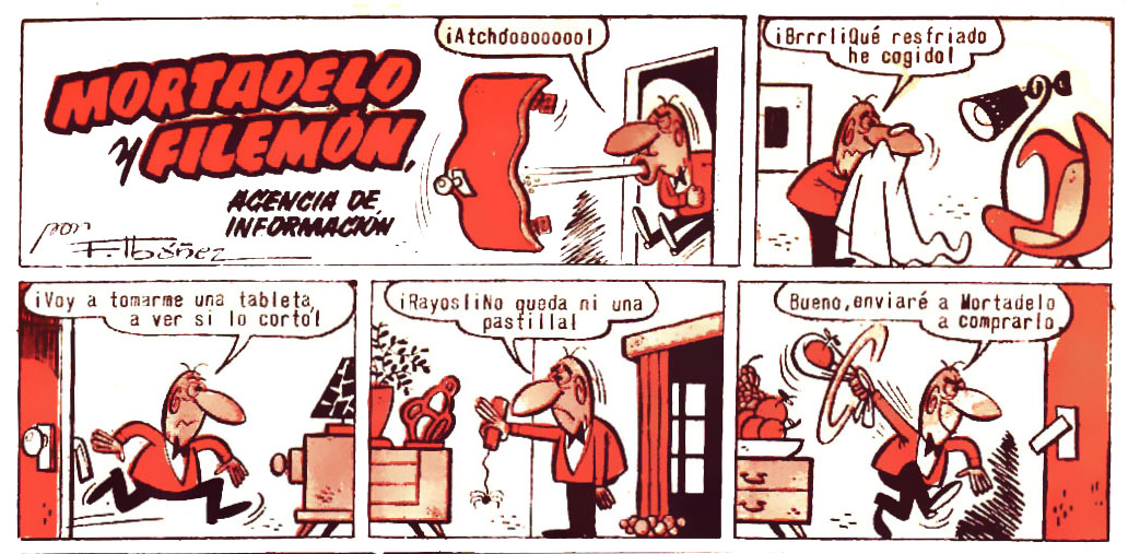 A Filemón se le han acabado las pastillas y envía a Mortadelo a que le compre una tableta pero eśte se presenta con un tablón en una carretilla.