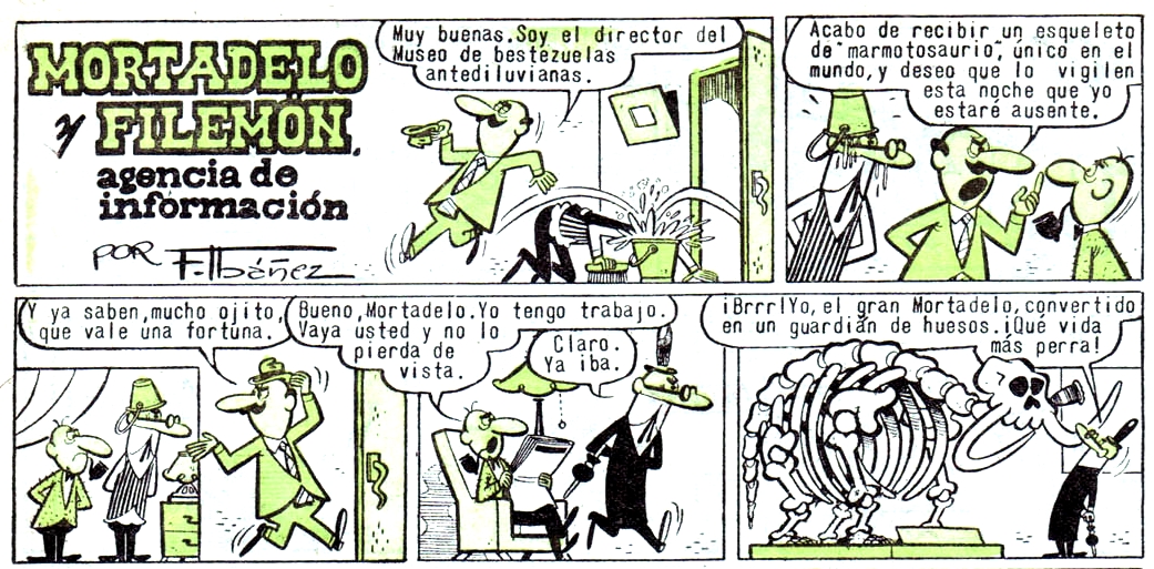 El director del museo de Bestezuelas Antediluvianas ha recibido el esqueleto de un marmotosaurio y contrata a Mortadelo y Filemón para que lo vigilen por la noche. Mortadelo deja a un perro guardián ante el esqueleto mientras se va de juerga y al can no se le ocurre otra cosa que ventilarse el esqueleto completo del dinosaurio.