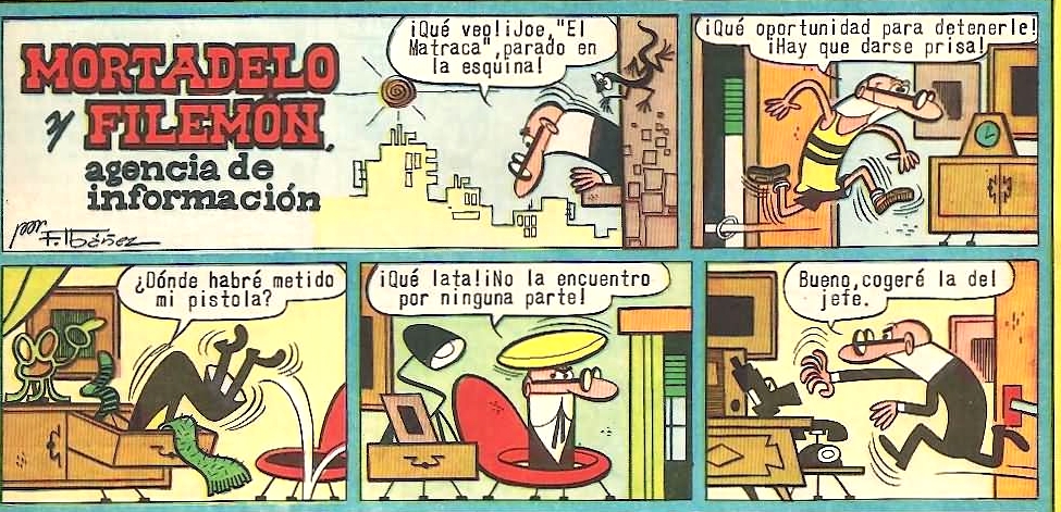 Mortadelo se asoma por la ventana y ve a Joe el "Matraca" a la puerta de la agencia. Enseguida baja pistola en mano a detenerle y éste devora el arma en un plis plas. Mortadelo había cogido una pistola de chocolate que Filemón había comprado para su sobrino.