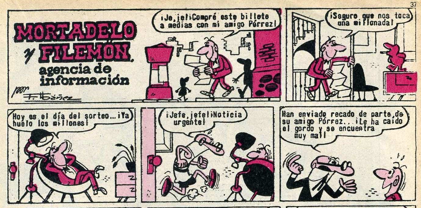 Filemón juega un número de lotería a medias con su amigo Pórrez así que cuando Mortadelo le confiesa que su amigo ha llamado para decir que le ha caído el gordo Filemón se creerá millonario cuando la realidad es que sobre Pórrez cayó el gordo Mantequini, su vecino del tercero.