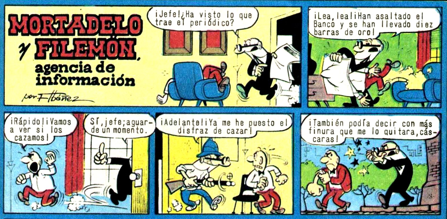 Mortadelo se entera por el periódico de que han asaltado un banco y se han llevado diez barras de oro, por lo que él y su jefe deciden salir a capturar a los ladrones. Al rato oyen una conversación entre dos tipos con un saco sobre unas barras doraditas y relucientes, por lo que no dudan en atacarlos sin contemplaciones pero, cuando abran el saco, comprobarán que las diez barras que éste contenía eran de pan.