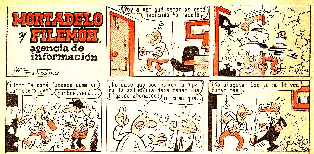 Mortadelo no hace más que fumar como un carretero y Filemón dice que no quiere verlo fumar más pero, al cabo de un rato, lo vuelve a sorprender fumando. Mortadelo improvisa y le dice a su jefe que ha cumplido sus órdenes: ya fuma más sino igual que antes.